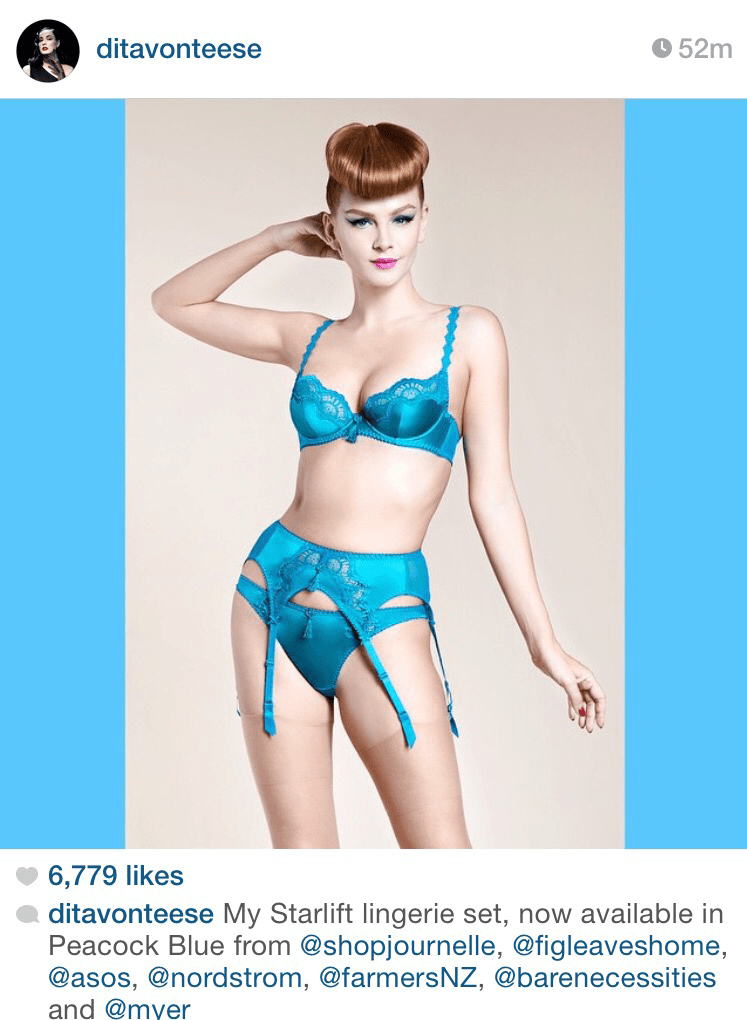 A couple of days ago Dita Von Teese ran two photos one after the other on her Instagram feed showing one of her new lingerie lines.