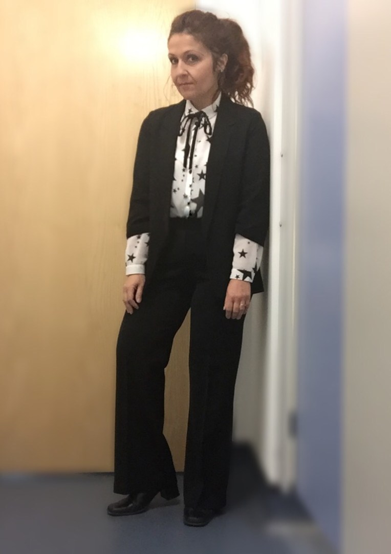 Jacket – Dorothy Perkins, Blouse H&M, Bow – home made, Trousers – Wallis, Boots – Next.