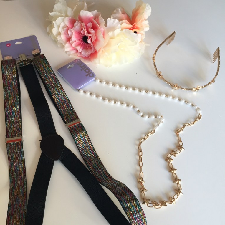 7) Claires Accessories floral crown, diamante headband, pearl and stud necklace and lurex braces – all £1 each (from £10 – £5)