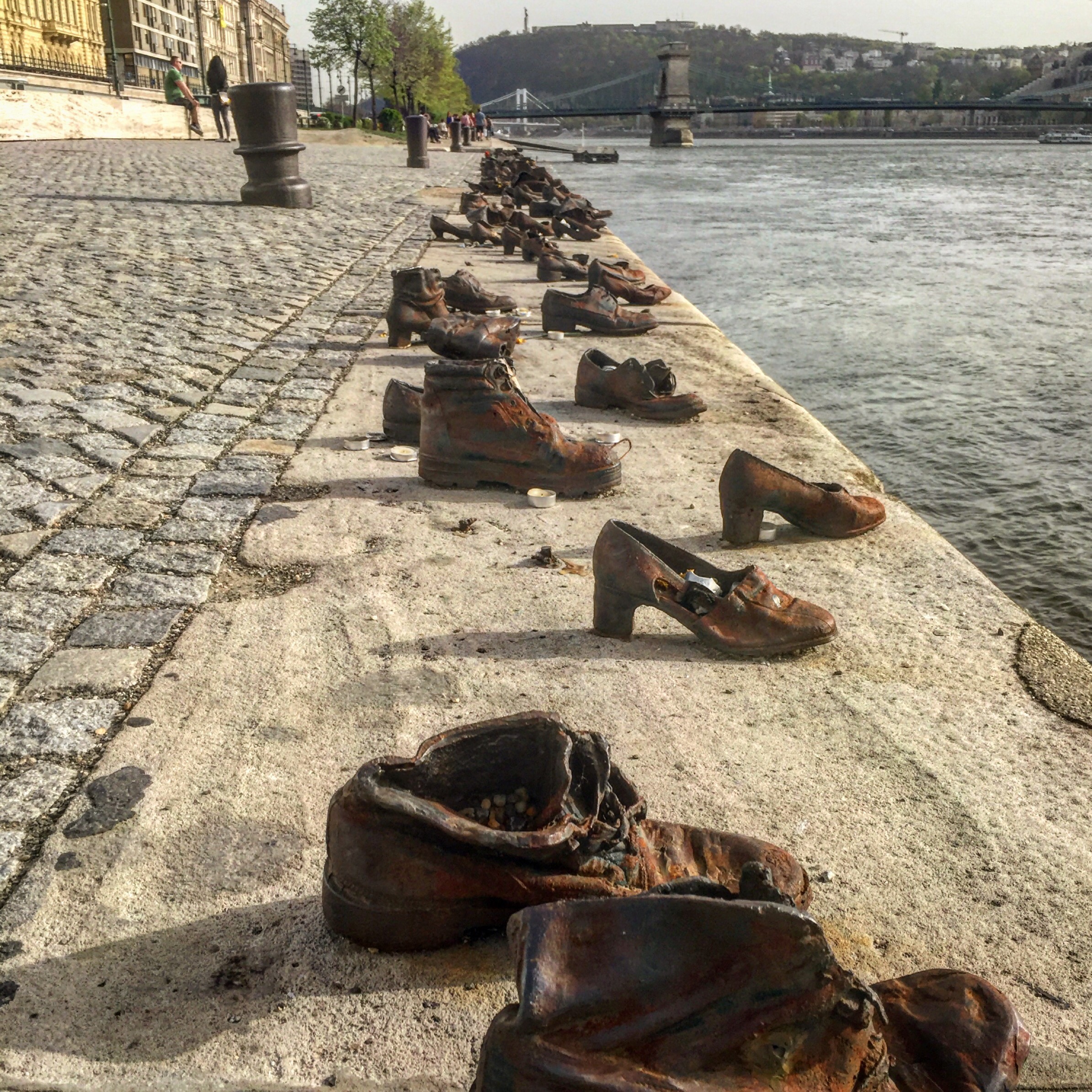Top Tip – book your cruise ahead at one of the tourist information points instead of being hassled at the waterside by the many different reps who may try and overcharge you. artwork on the river bank remembering jews killed during the war. Budapest suffered terribly during WW2the famous chain bridge