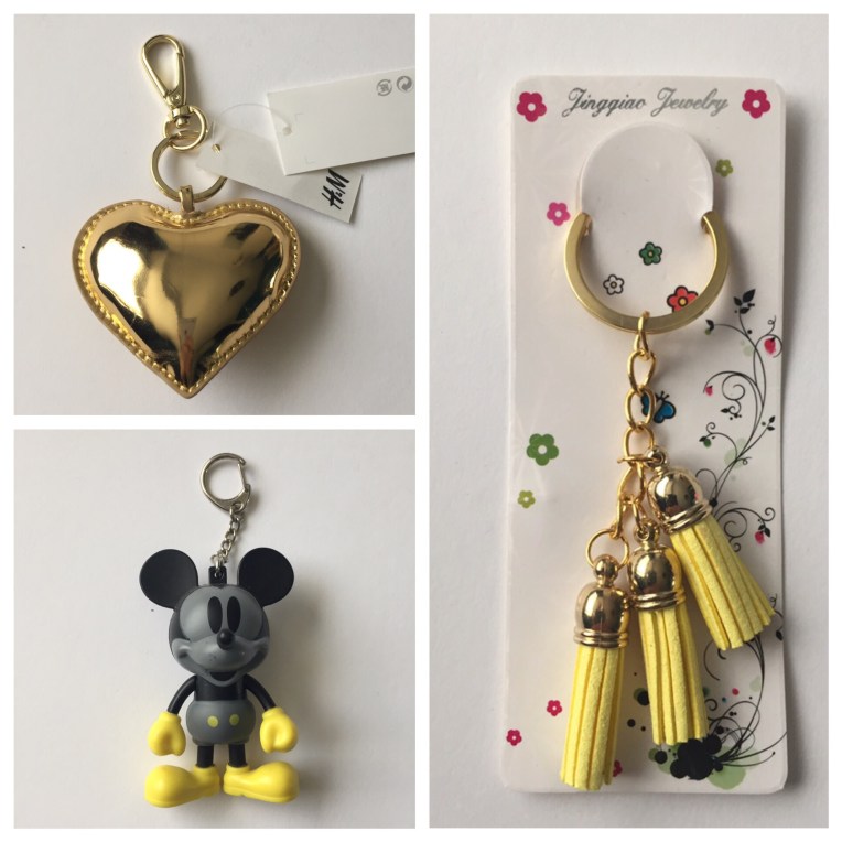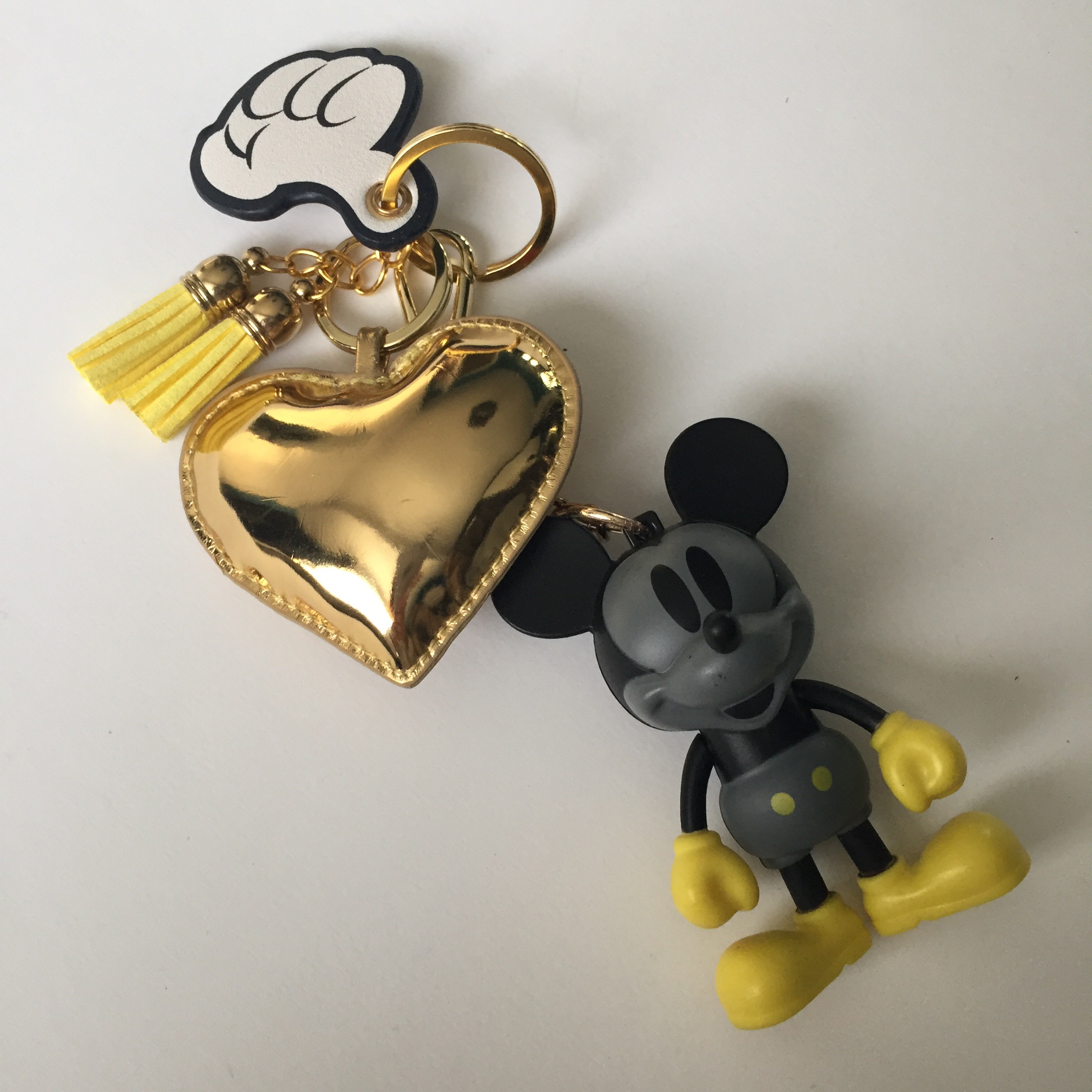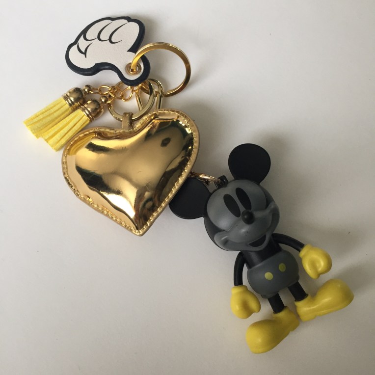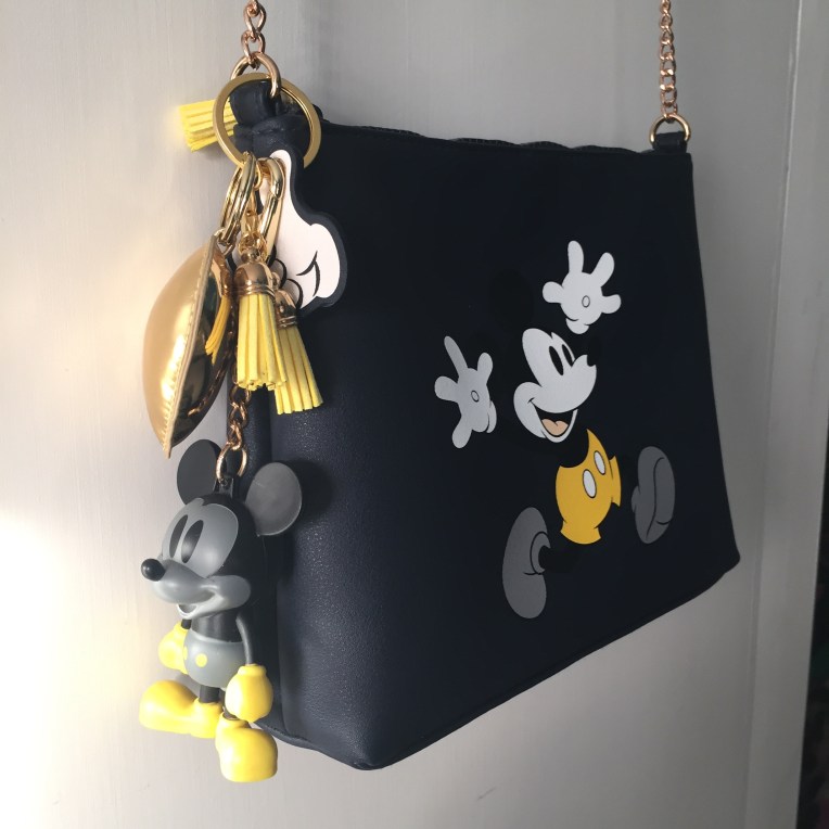 I then added the deconstructed pieces to a large Mickey Mouse keyring I had trawled eBay for. This was the key item of the bag upgrade and it took me a while to find as I wanted him to match the colours of the bag print exactly. The key to customisation is making sure your finish is good and all your components look like they were meant to be there i.e. dont use anything in a silver metal if the rest of the bag is finished in gold for example.