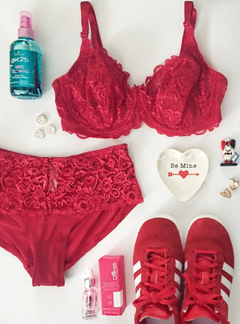 I love wearing nice underwear whatever the day and Valentines Day demands some red accents so why not your undies! This lace bra and knicker set (£15 from Peacocks) is sexy but still wearable – as a 43year old, DD cup size with a mummy tummy, Ann Summers style is just not going to work for me! Feeling confident is sexy, right? The Schwarzkopf Mind Blowing Spray is a new discovery for me and its amazing! It makes your hair dry so fast and makes straightening really easy. The ‘Be Mine’ heart dish (£10 from Clintons) is perfect to put my rings on at night and the Harley Quinn Lego minifigure (£4 from all good Lego retailers) is a little gift from my boyfriend who just loves Lego (and I love Harley). The heart earrings were from the New Look sale and look really cute on as do my red Adidas Gazelle trainers – I’ve wanted a pair for ages so treated myself in the January sales and by buying the kids version (they go up to UK 5.5) I saved a fortune! The Skin Chemists Rose Quartz facial oil (£24.99 from Skin Chemists) is still keeping my skin soft and radiant (for more info see my review of it here) and smells lovely…just the thing to make you feel great about yourself!