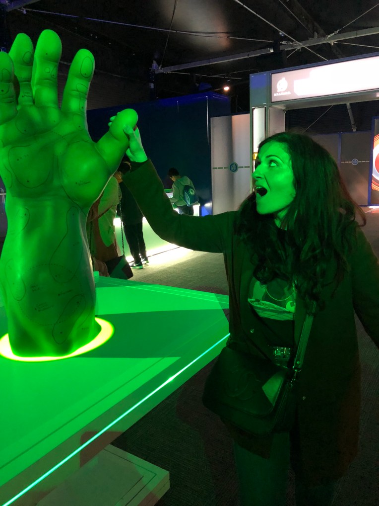 Amongst other exhibits, you can hold Hulks hand, ride Captain Americas bike or hold his shield, Follow Antmans ants or try and lift Thors hammer! I failed 😦