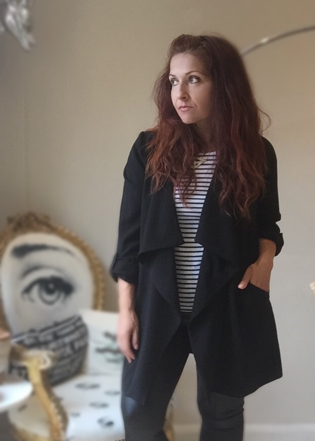 For a simple, chic look I’ve styled it today with a striped breton tee, wet look leggings and black wedge sandals. Its super flattering and looks as good with jeans or a dress…I really love it.