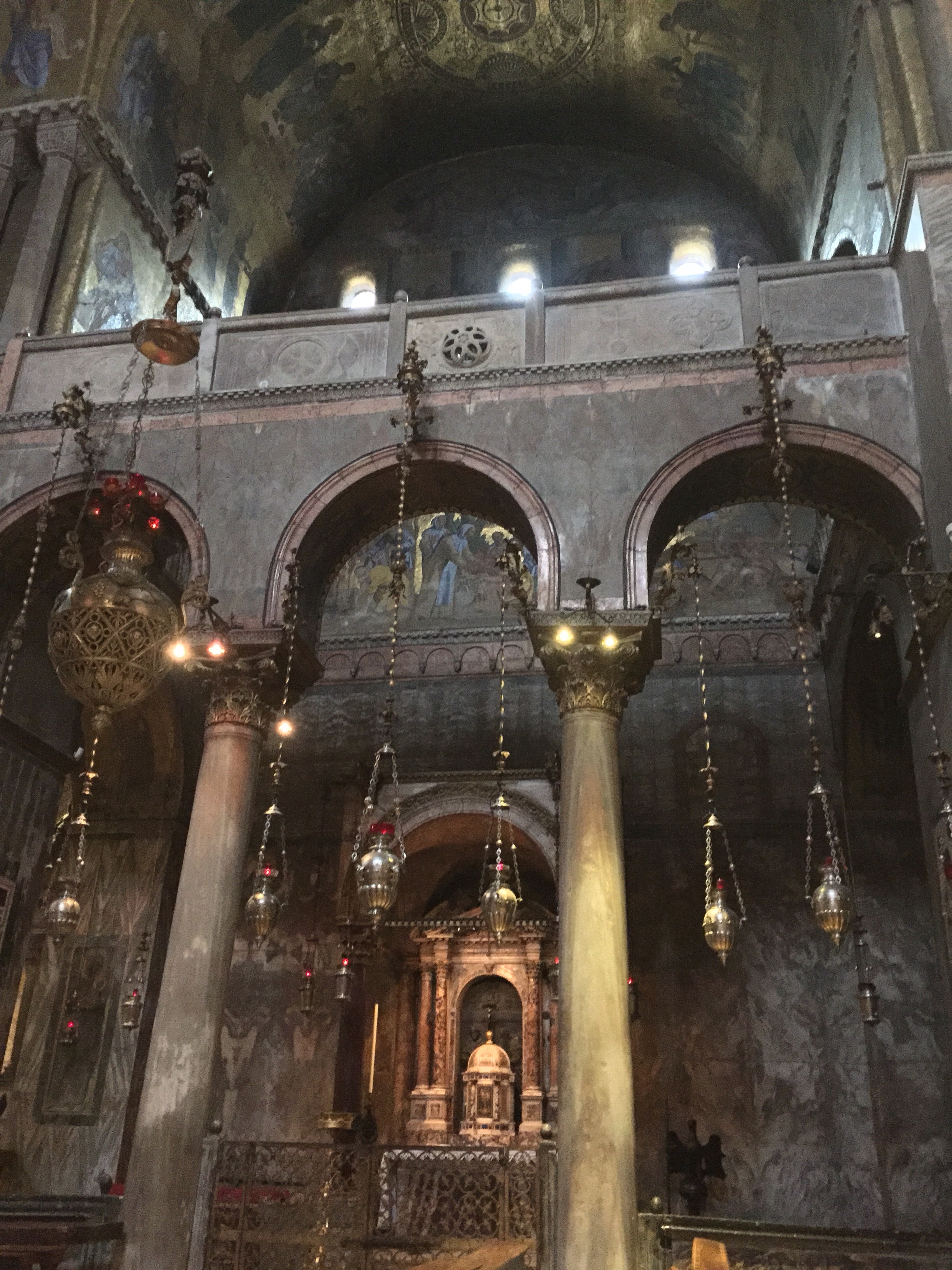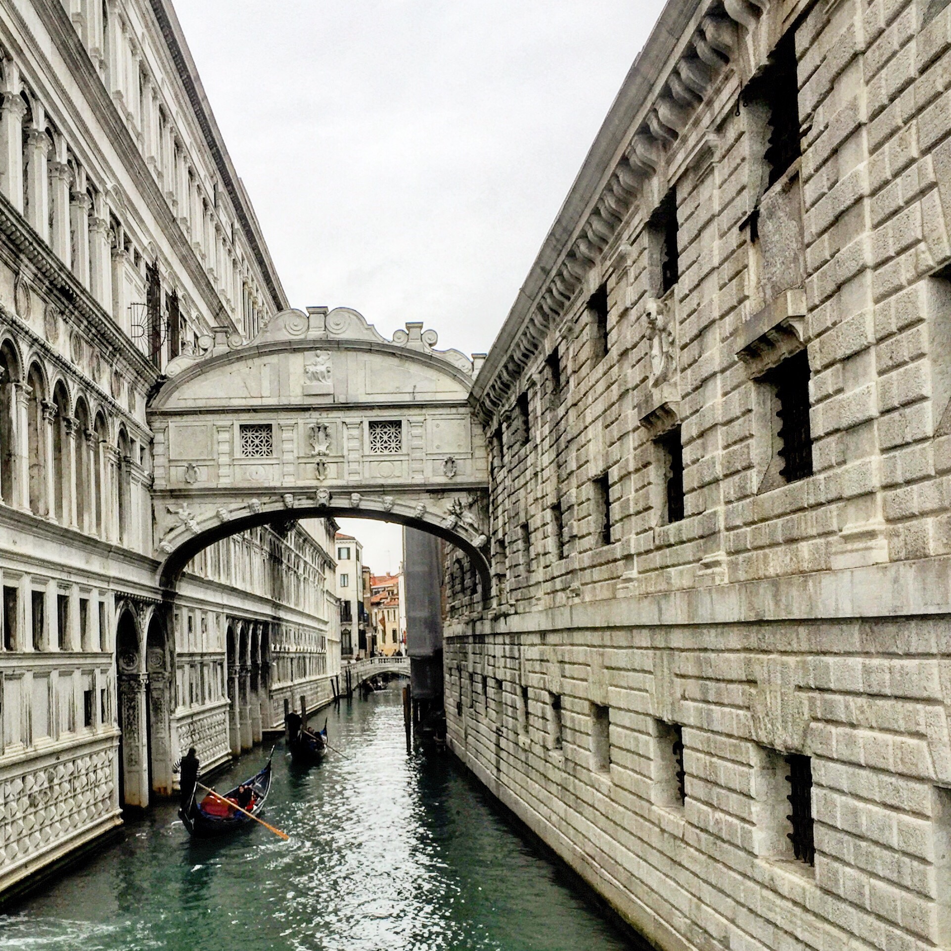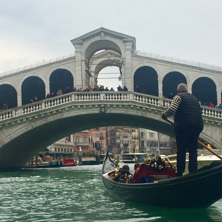 The Rialto Bridge is the oldest of the four bridges spanning the Grand Canal. Connecting the Sestieri districts of San Marco and San Polo, it has been rebuilt several times since its first construction in the 12th century, and is now a significant tourist attraction.  It is huge – breath-takingly so, with shops running down the centre of it, it is so wide.  Again it is VERY busy with tourists so it is easier to see from a boat than on the actual bridge. As well as walking it, we went underneath it in a gondola and it was really something – definitely recommended.