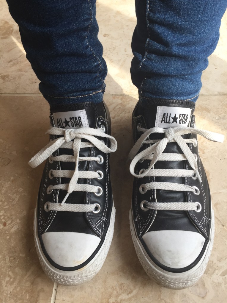 This look works with any casual flat shoe but I personally love a pair of Converse All Stars as they go with anything. When a leather version of their iconic black trainer came out I had to have a pair…they are a mixture of casual and smart and can be worn whatever the weather! If Converse aren’t your thing, just replace with any plimsoll type shoe.