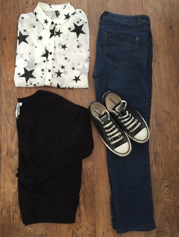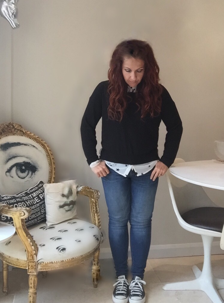 This is a great, easy to wear outfit for days when you want to feel comfortable yet still a little dressed up. Great for running around; wearing plimsolls and jeans is always a winner and the addition of a smart shirt under a jumper makes this look a little more dressy without any extra work.