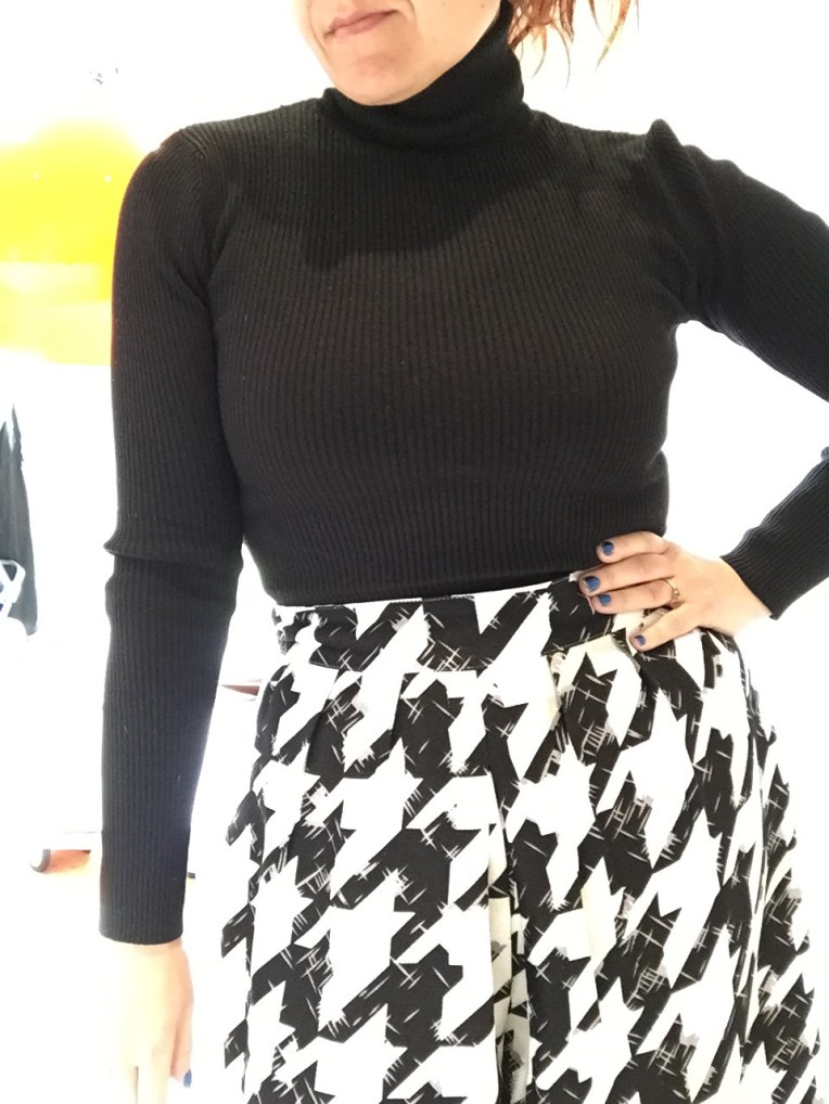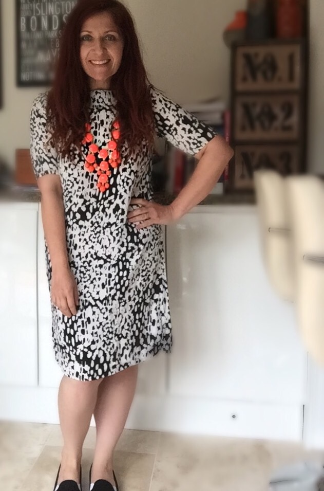 Todays outfit is a simple piece of styling – a monochrome print with a bright statement necklace. This piece of styling works with any black and white pattern and any colour of statement necklace. Simple!