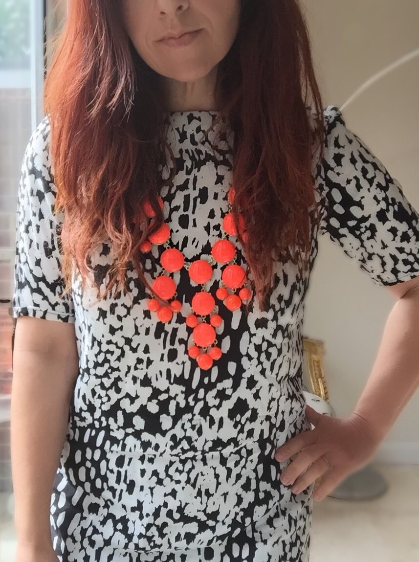 I love the ‘pop’ of the necklace against the dress and find this style, with its longish short sleeves is a very wearable day dress. I love orange as an accent colour so love the boldness of this necklace.